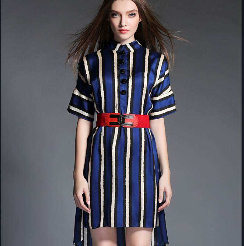2015早秋新款歐洲站大牌女裝批發條紋立領不規則短袖連衣裙1819 /