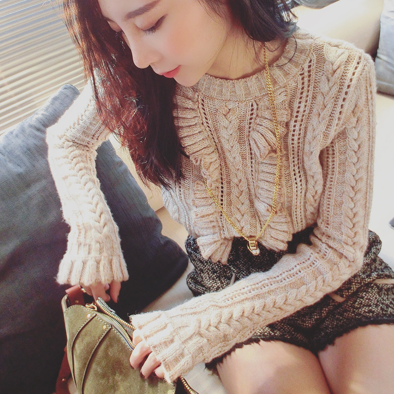 現貨 秋冬裝甜美荷葉花邊木耳邊圓領套頭長袖針織衫修身毛衣 /