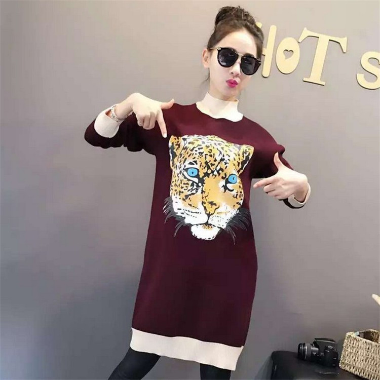 2015冬季新款女裝 歐洲站時尚休閑老虎圖案印花打底針織連衣裙 /