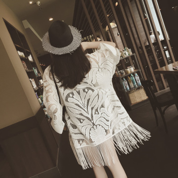 2015下擺流蘇披肩花朵鏤空針織開衫中長款薄開衫空調衫防曬衫 /