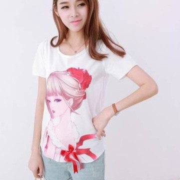 2105春夏新款女裝韓版百搭美女圖案印花圓領短袖女雪紡衫T恤 /