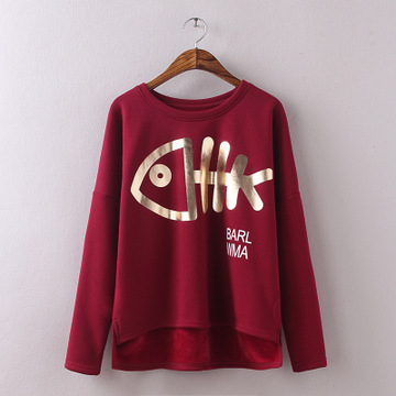 胖MM大碼加絨女裝時尚寬松加厚不倒絨卡通魚骨頭印花短款打底衫 /
