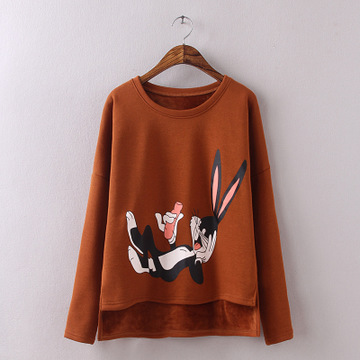 冬季新款胖MM大碼加絨女裝時尚寬松加厚不倒絨印花兔子短款打底衫 /