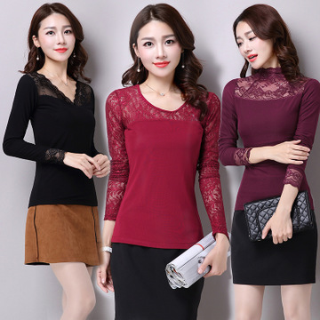 發(fā)財友2015冬季新款女士時尚蕾絲長袖加絨高領(lǐng)圓領(lǐng)V領(lǐng)打底衫女 /