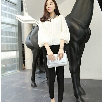 2015韓版甜美小香風(fēng)毛衣寬松套頭燈籠袖短款針織衫純色打底衫長袖 /