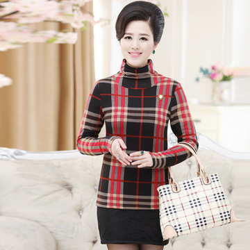 中老年女裝秋冬加絨厚韓版英倫格子打底衫媽媽裝大碼高領保暖T恤 /