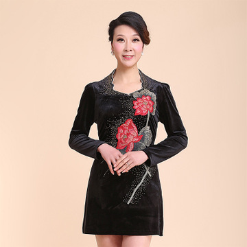 新款特批2015年中老年大碼女裝春裝連衣裙金絲絨手工繡花水鉆女裙 /
