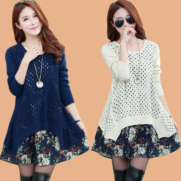 廠家直銷2015新款韓版寬松毛衣女打底衫中長款套頭棉麻拼接假兩件 /