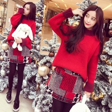 2015冬裝新款圓 領加厚韓版洋氣袖口設計 撞色寬松套頭針織毛衣女 /