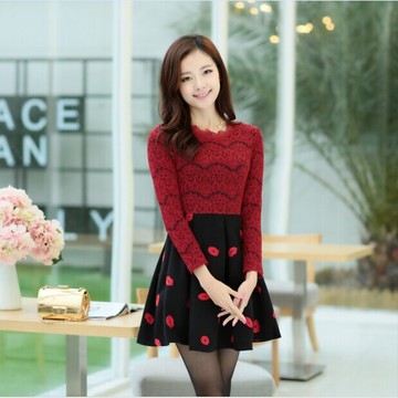 2015冬裝新款長袖加絨加厚蕾絲毛呢連衣裙修身百搭打底裙 /