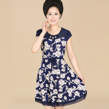 新款中老年花色連衣裙跳舞裙媽媽裝大碼裙子中年人修身顯瘦連衣裙 /