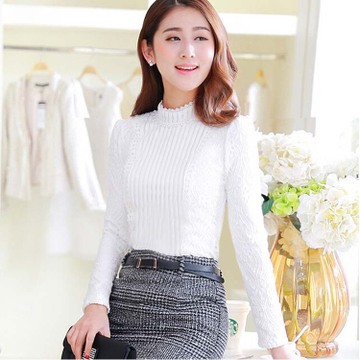 2015秋冬新款韓版修身長袖立領鑲鉆加絨加厚保暖蕾絲打底衫女款 /