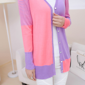 歐美秋裝新款中長款拼接長袖開衫薄外套條紋V領毛衣針織開衫女裝 /