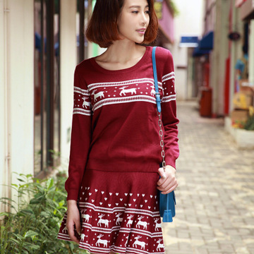 2015秋裝女韓版新品長袖毛衣兩件套打底針織衫包臀修身套裝裙潮 /