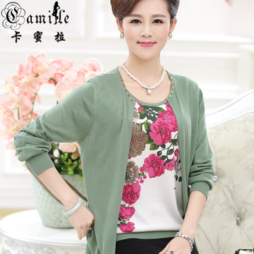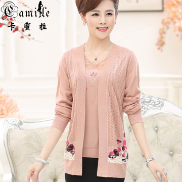 中老年女裝秋裝新款真兩件套針織開衫中年女式繡花長袖大碼媽媽裝 /