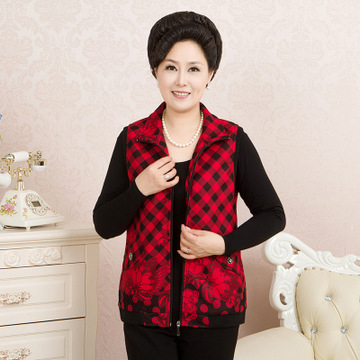 2015秋季新款中老年女裝馬甲中年媽媽裝大碼翻領格子休閑馬夾上衣 /