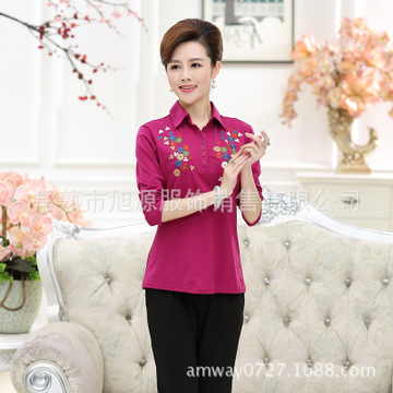 中老年女裝長袖修身翻領大碼女上衣中年女T恤媽媽裝繡花打底衫 /
