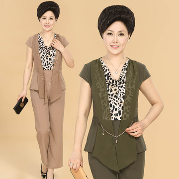 2015新款兩件套中年女士短袖T恤堆堆領(lǐng)套裝夏中老年大碼女裝夏裝 /