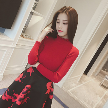 2015秋冬裝韓國新款甜美木耳邊領(lǐng)修身打底衫套頭針織衫女 /