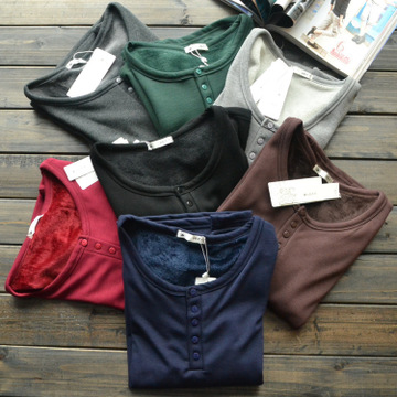 韓版五個扣開領暖倍兒不倒絨加絨加厚修身打底衫純色長袖打底T恤 /
