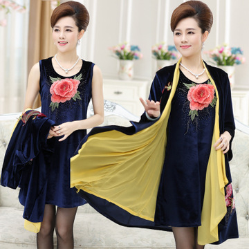 中老年女裝秋裝中年媽媽裝大媽金絲絨長袖t恤中長款三件套連衣裙 /