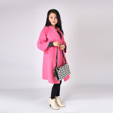 韓版女款顯瘦 長款毛呢風(fēng)衣 玫紅 肉色可選 /
