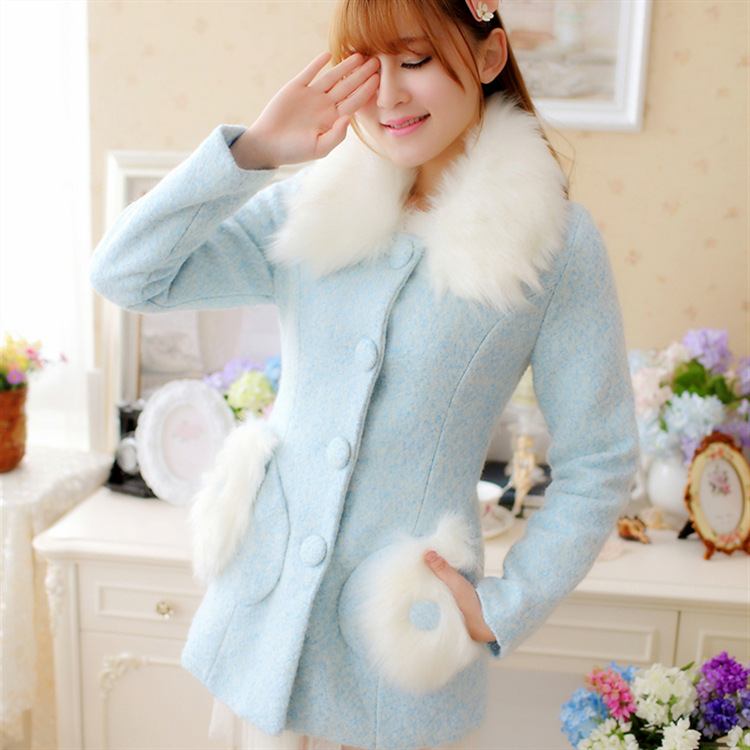 2015冬裝新款甜美 顯瘦狐貍毛領 短款毛呢外套 皮草加厚大衣女裝 /