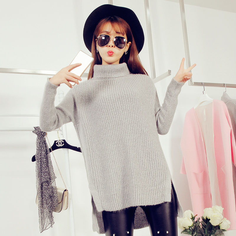 秋冬新款潮毛衣外套女韓版寬松高領下擺開叉針織套頭厚打底衫女 /