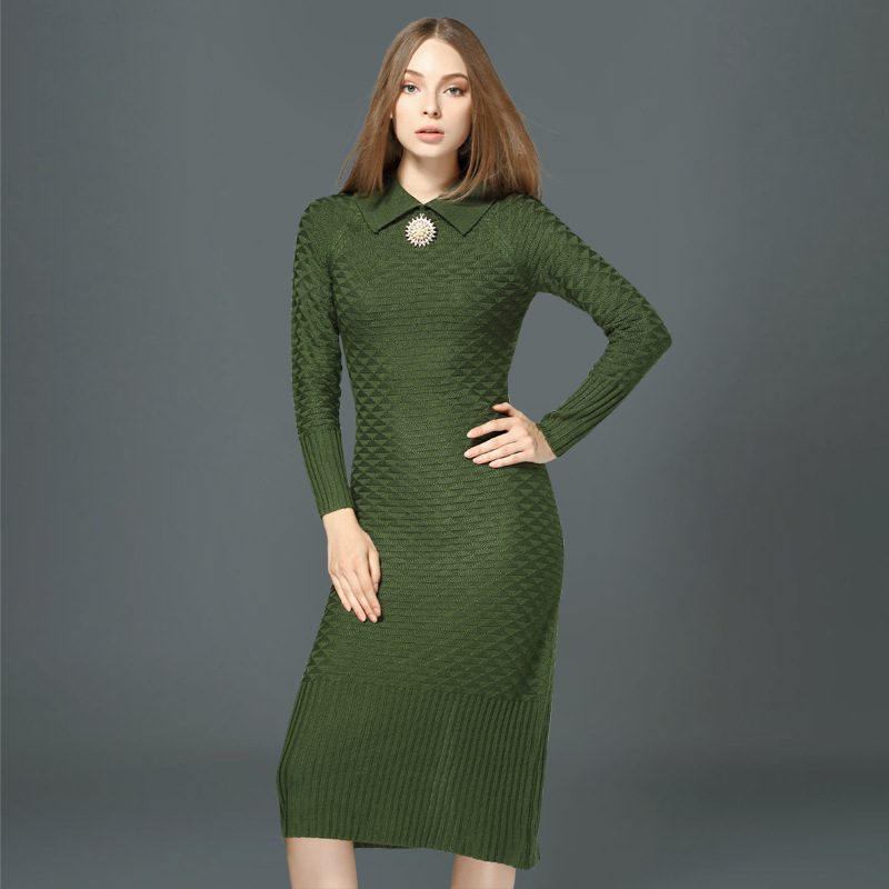 歐洲站2015秋冬新款歐美針織連衣裙暗花翻領釘珠毛衣精品羊毛長裙 /