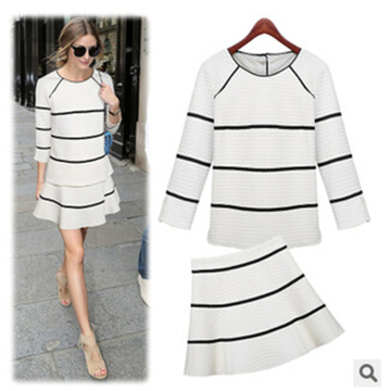 2014歐美秋季新款歐洲站圓領長袖黑白套裝裙 /