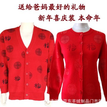 中老年情侶裝爸媽紅色喜慶裝福字羊毛衫開衫加厚大碼秋冬毛衣外套 /