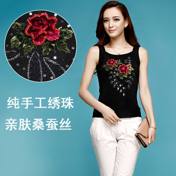 手工繡花2015夏季新款修身顯瘦寬帶外穿百搭桑蠶絲針織吊帶背心女 /