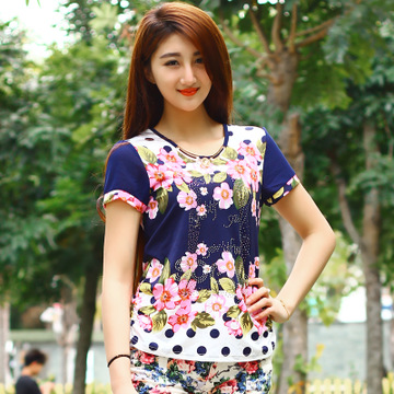 2015新款中年女裝短袖T恤 時尚修身圓領(lǐng)夏裝印花上衣 /