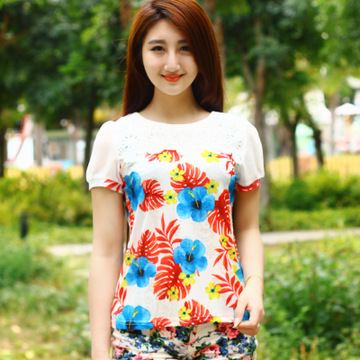 2015新款夏裝中年女士服裝 休閑寬松印花雪紡女裝短袖上衣T恤 /