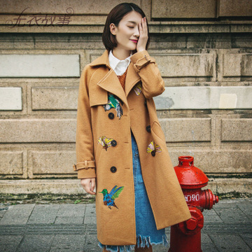 羊毛呢大衣女2015新款秋冬裝歐美時尚翻領精美刺繡雙排扣毛呢外套 /