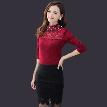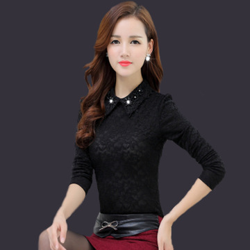 加絨加厚打底衫2015秋冬新款翻領修身蕾絲衫女釘珠長袖打底衫批發 /