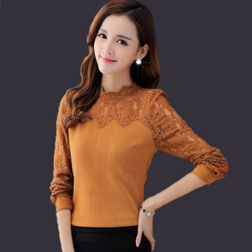 女士蕾絲衫2015秋冬新款韓版高領上衣加絨加厚長袖打底衫一件代發 /