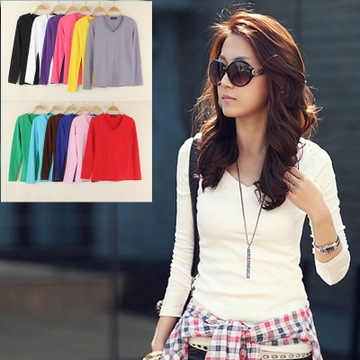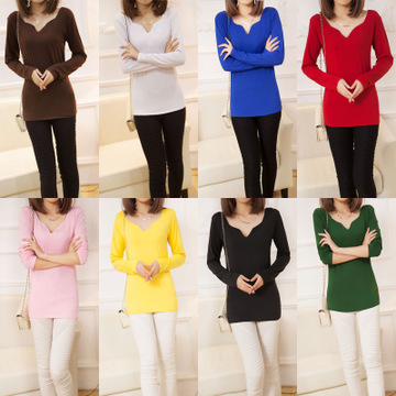 時尚V領加絨保暖打底衫女裝上衣包郵純色T恤 /