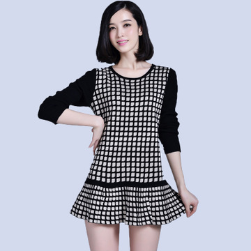 2015新款女士針織衫時尚長款羊毛衫 荷葉裙擺格子針織羊毛連衣裙 /