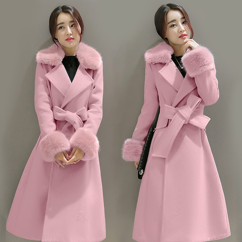 新款韓版毛領修身長款毛呢外套女系帶收腰西裝領女士毛呢大衣外套 /