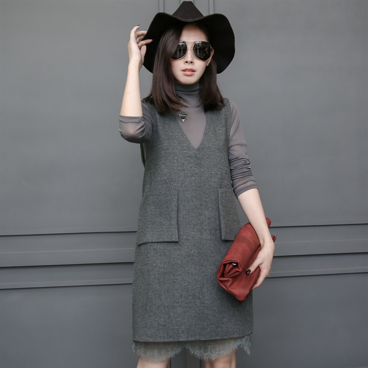 2015歐洲站秋冬歐貨蕾絲打底衫兩件套時尚長袖秋冬毛呢連衣裙女 /