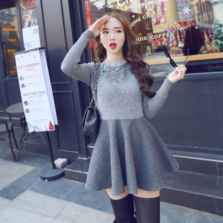 2015秋冬 韓版新款 高檔時尚毛呢蕾絲拼接連衣裙 廠家直銷 /