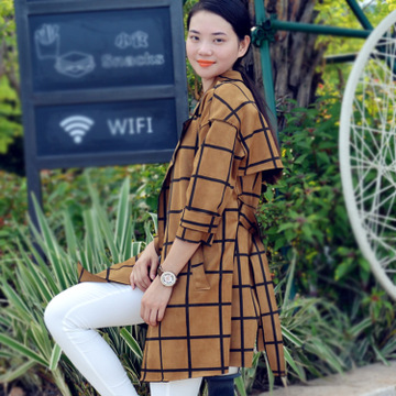 2015年秋冬季新款潮流時尚鹿皮絨中長款修身顯瘦格子皮外套女大衣 /