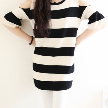 淘工廠現貨貼牌加工韓范兒針織衫打底衫荷葉袖條紋露肩針織毛衣女 /