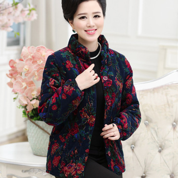 冬季新款休閑中老年女式棉大衣立領長袖印花單排扣修身媽媽裝批發 /