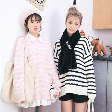 2015秋冬新款 中長款閨蜜裝條紋破洞撞色套頭毛衣針織衫 /