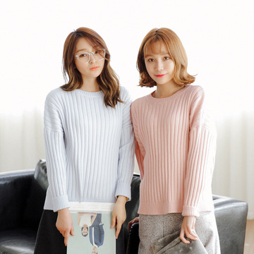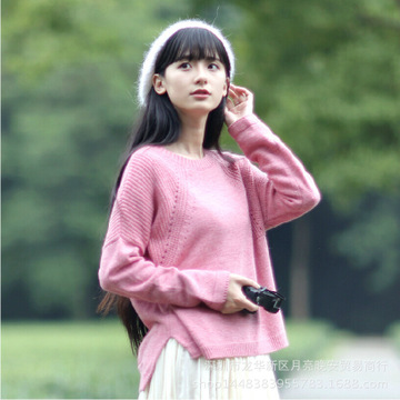 韓國東大門&2015新款學院風前短后長開叉圓領坑條兔絨套頭毛衣 /