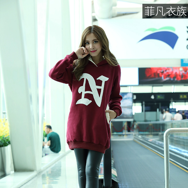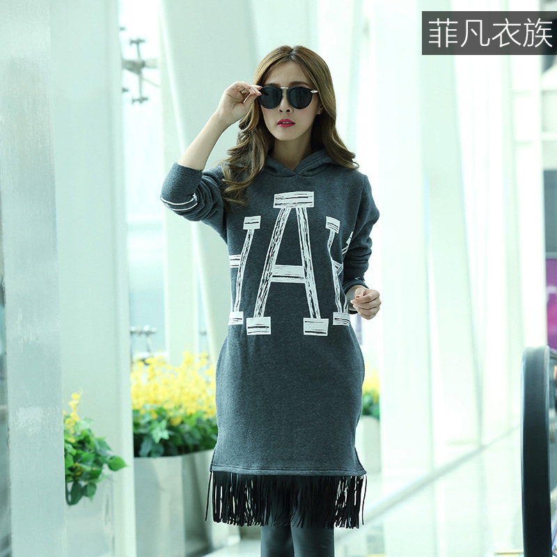 2015時尚休閑新款長裝全棉衛衣抓毛加厚顯瘦毛巾繡英文頭帽長裙 /
