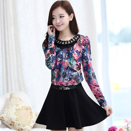 2015新款女長袖春裝新款韓版女裝修身印花雪紡衫襯衣大碼打底衫 /