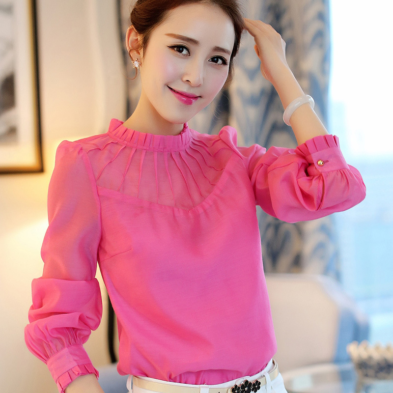 2015雪紡衫女春秋新款韓版修身長袖立領純色小衫女式打底衫女裝潮 /